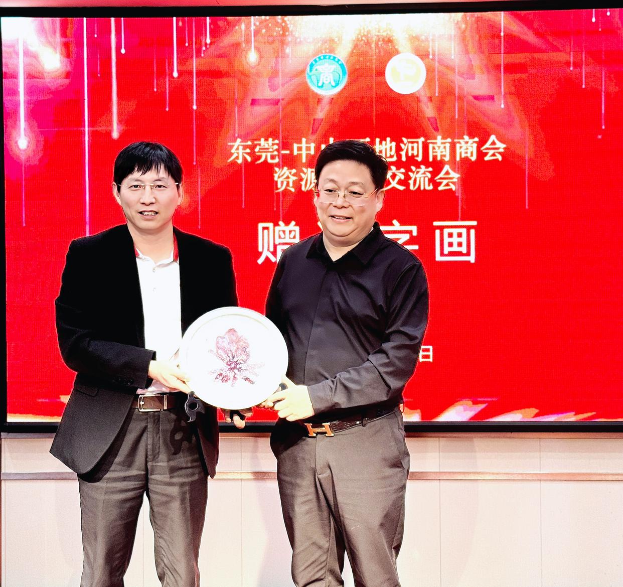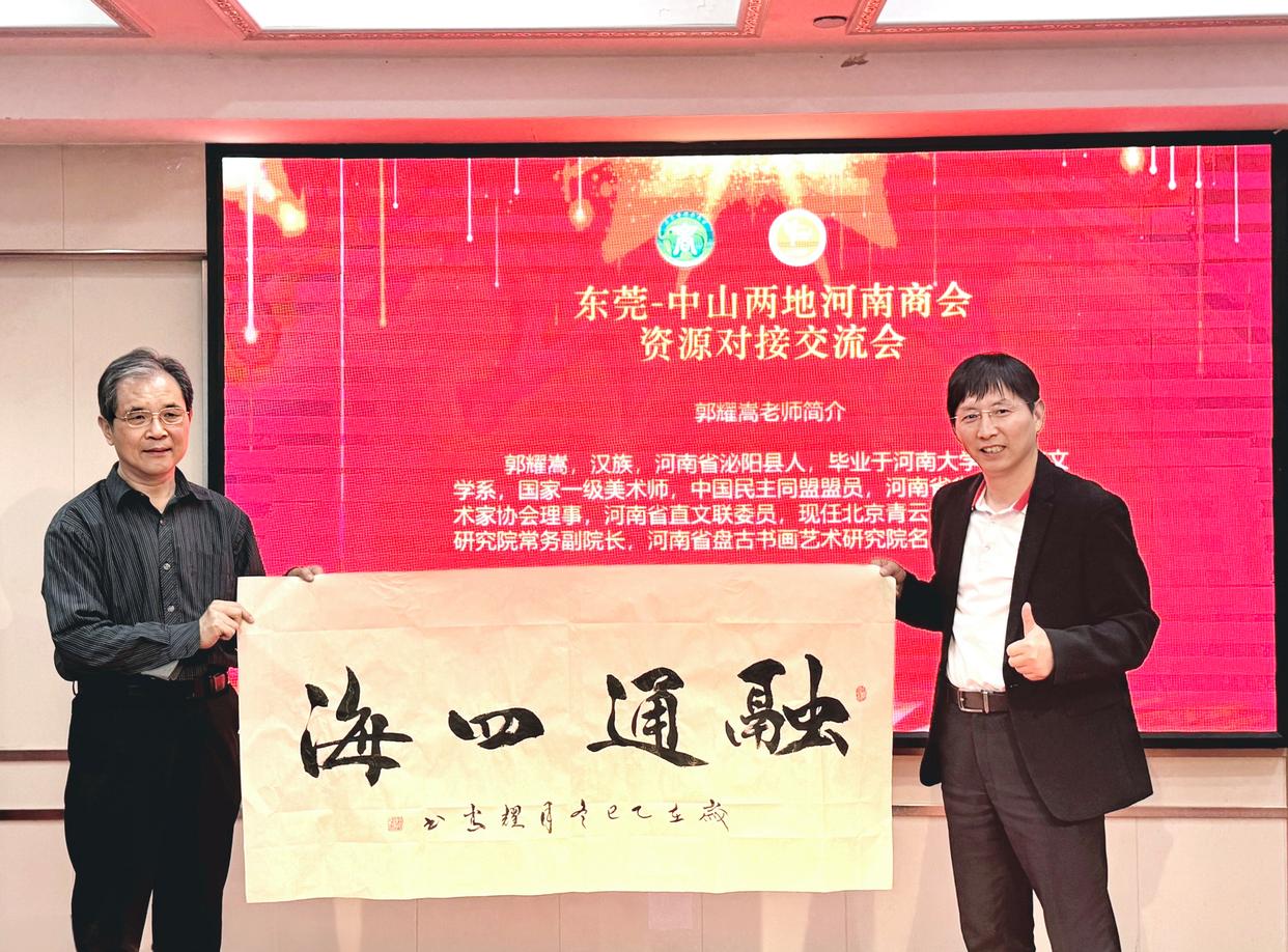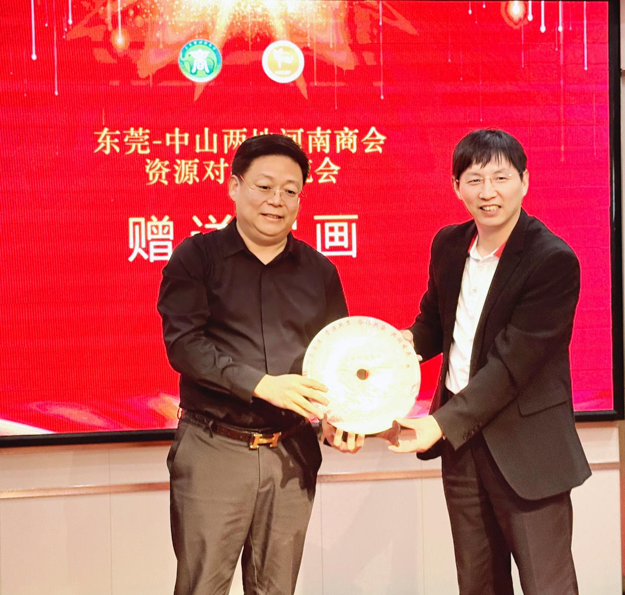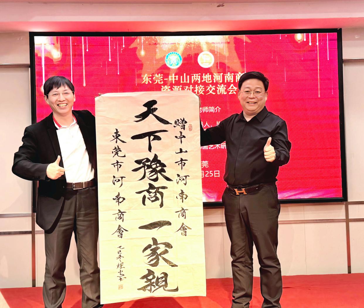 签约仪式后,双方互赠礼品。刘全贵会长代表东莞市河南商会向中山市河南商会赠送“天下豫商一家亲”字画。