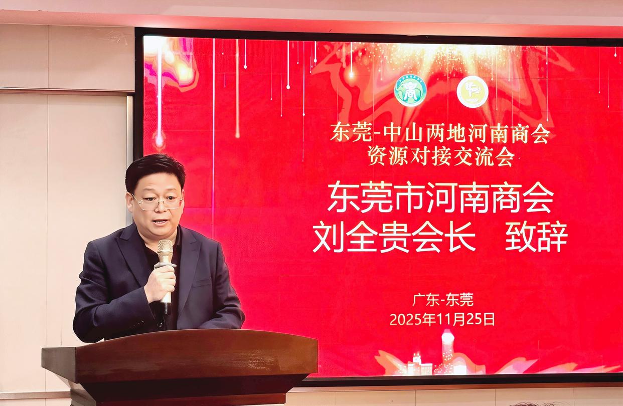 在交流午宴环节,东莞市河南商会会长刘全贵在致辞中对中山豫商代表团的到访表示热烈欢迎。他指出,本次对接不仅是情感的交流,更是资源的汇聚。东莞市河南商会始终致力于搭建高效务实的资源平台,推动会员企业互联互通、协同发展。