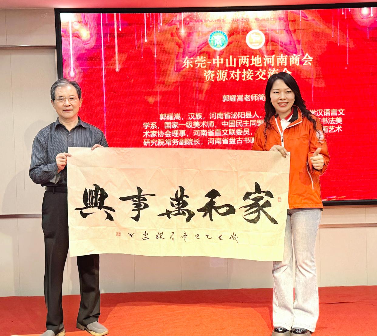 国家一级美术师、河南省直书法美术家协会理事、北京青云瀚海书画艺术研究院常务副院长郭耀嵩老师分别为林守金会长、王丽秘书长创作并赠送“融通四海”“家和万事兴”书法作品,寓意两地豫商情谊绵长、合作通达。